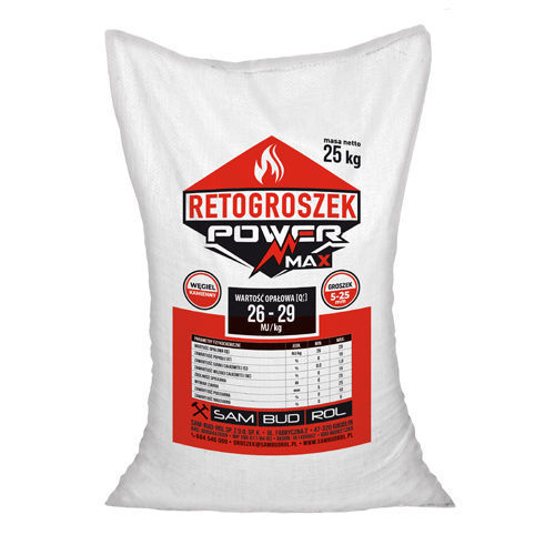 Dostępny w 25-kilogramowych workach polipropylenowych groszek marki POWER MAX to dobrze wyselekcjonowany surowiec. Bryłki węgla znajdujące się w worku cechują się dobrą wartością opałową, zamykająca się w przedziale od 26 do 29 MJ/kg. Również duże wrażenie robi zawartość popiołu w zakresie jedynie 3-6%.